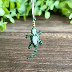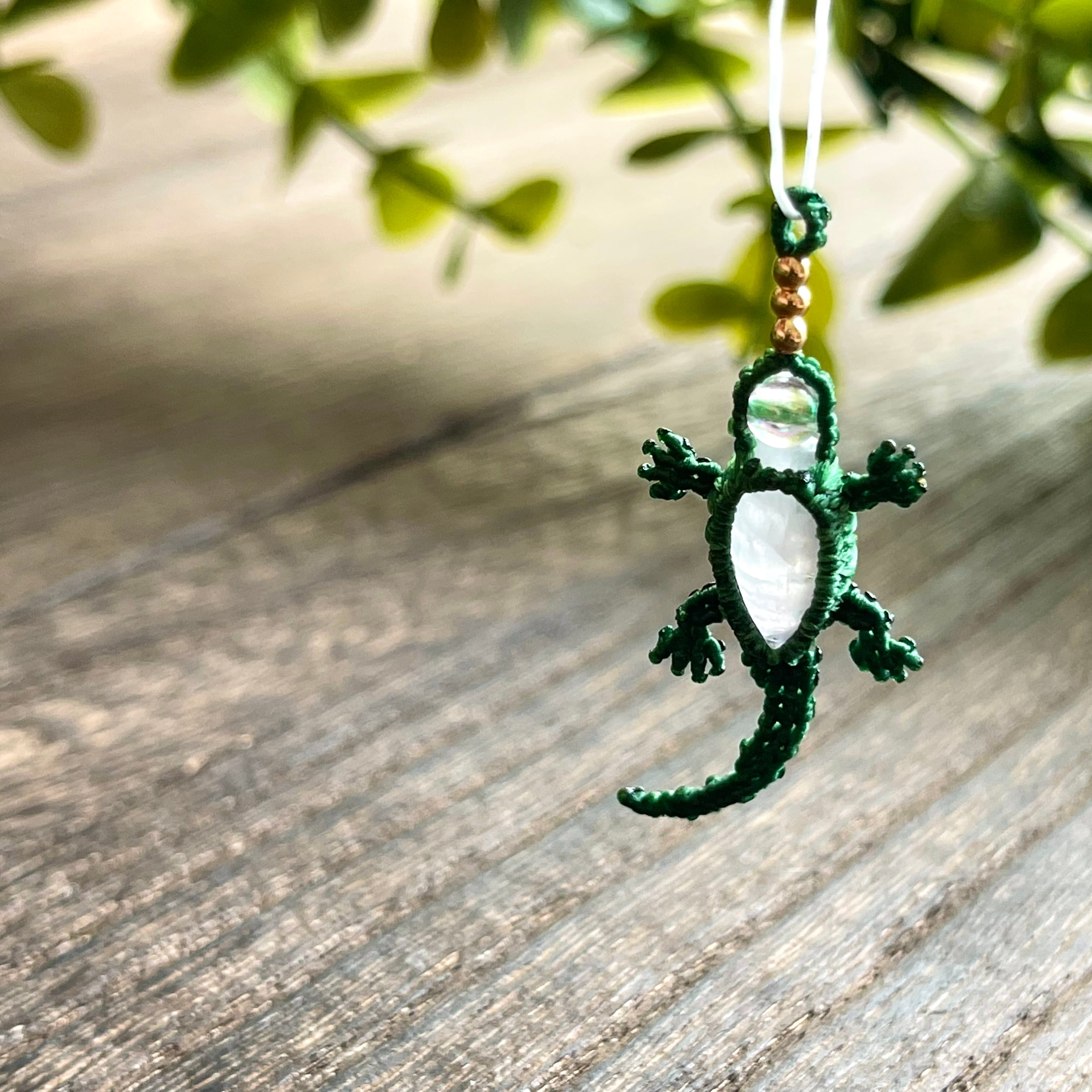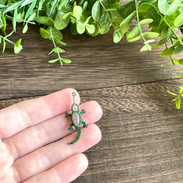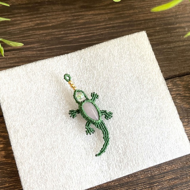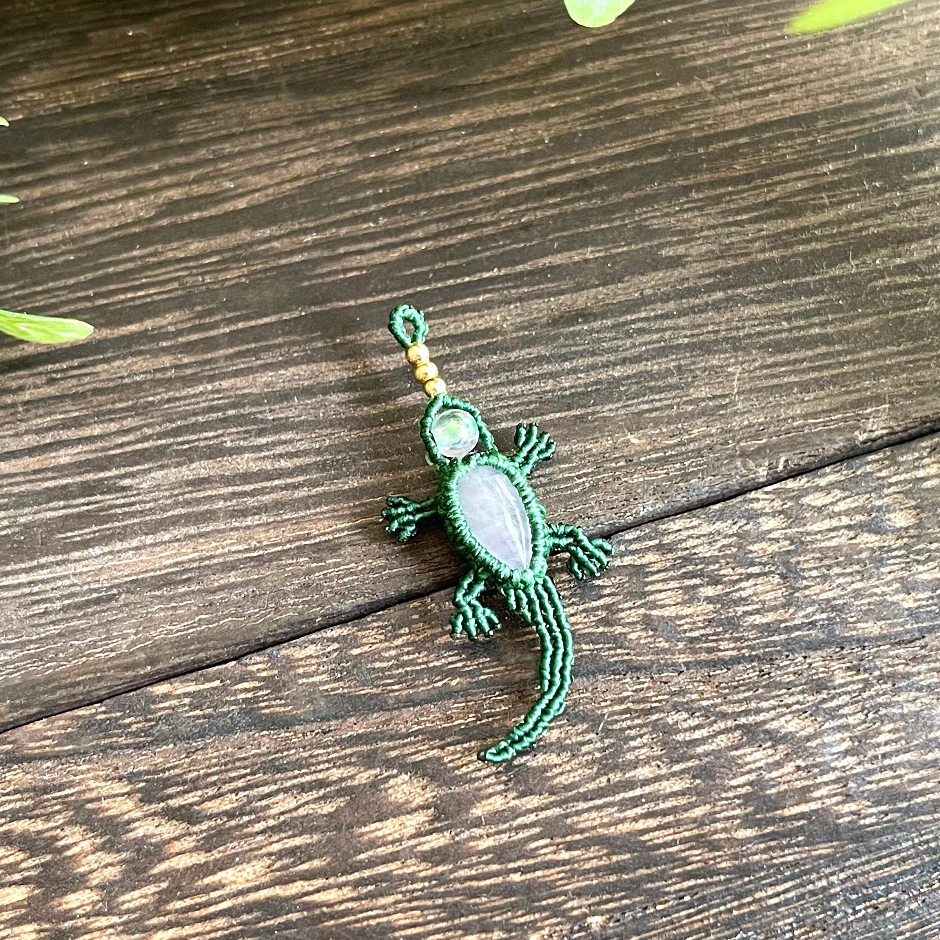 クンツァイト[トカゲ/ヤモリ/イモリ]マクラメアクセサリー〈チャーム、ネックレス、ピアス、イヤリング〉