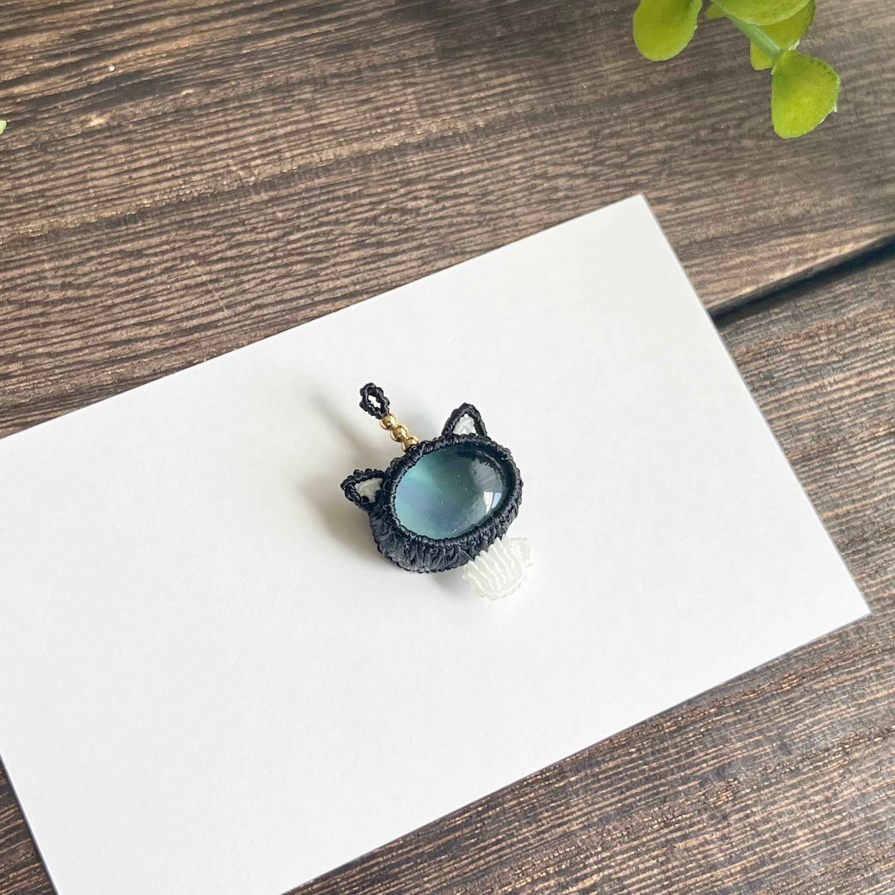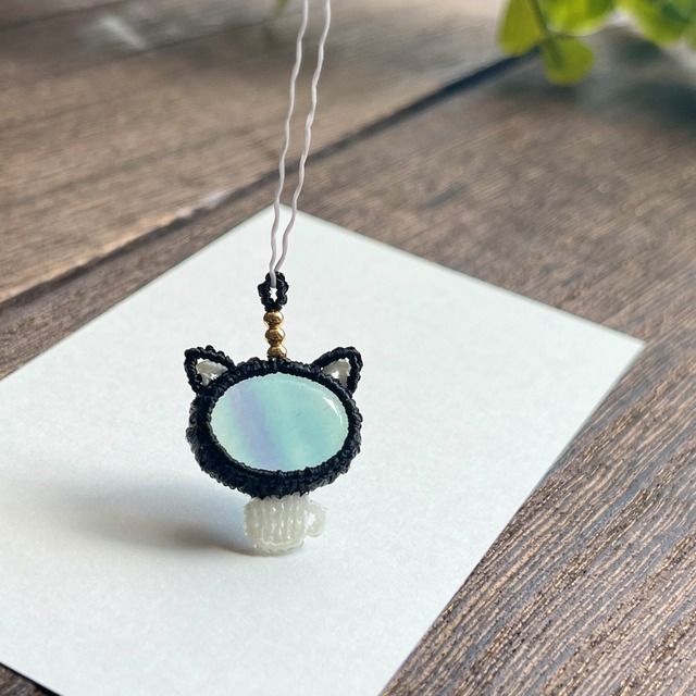 【限定】フローライト[ティーカップ黒ネコ]マクラメアクセサリー〈チャーム、ネックレス、ピアス、イヤリング〉