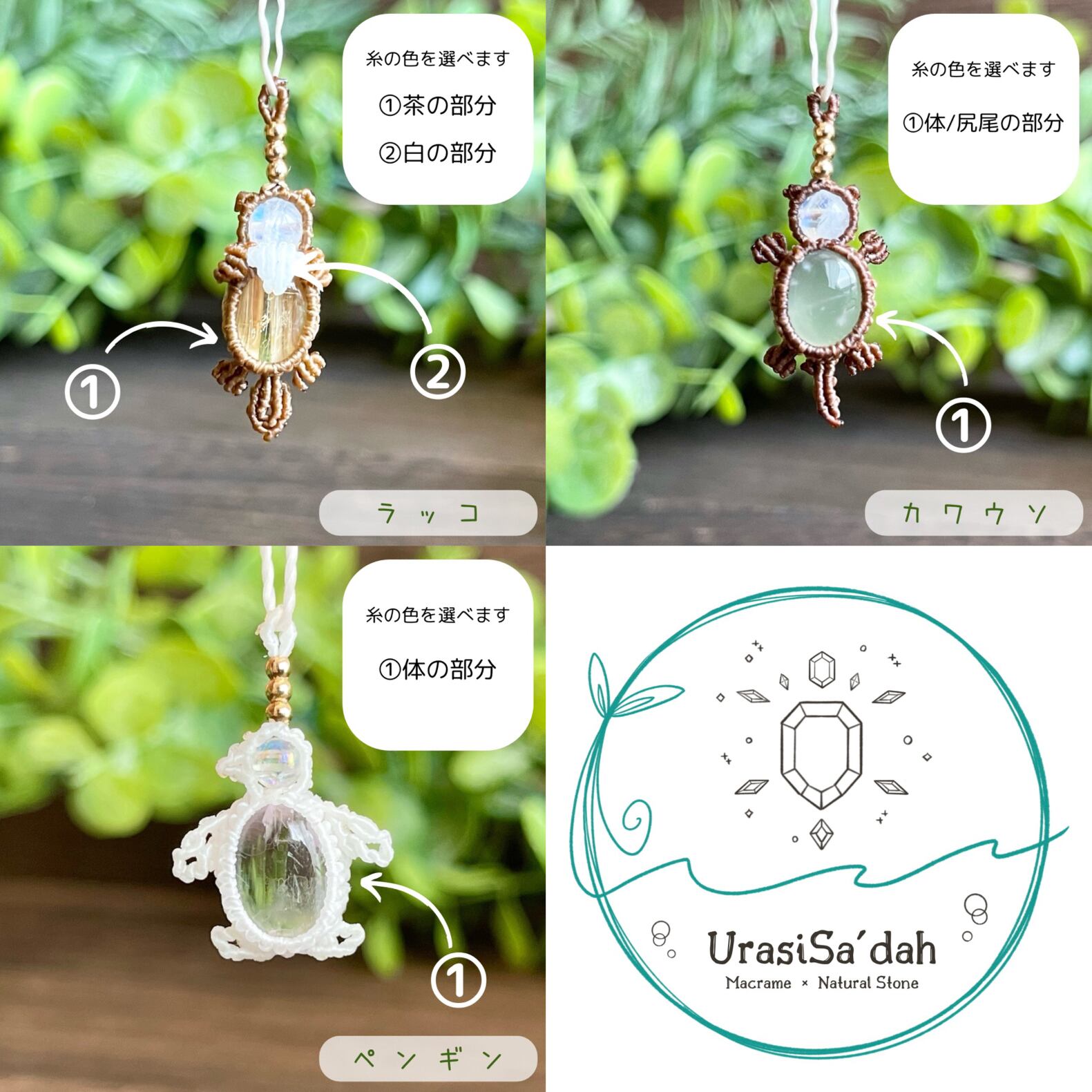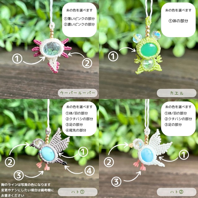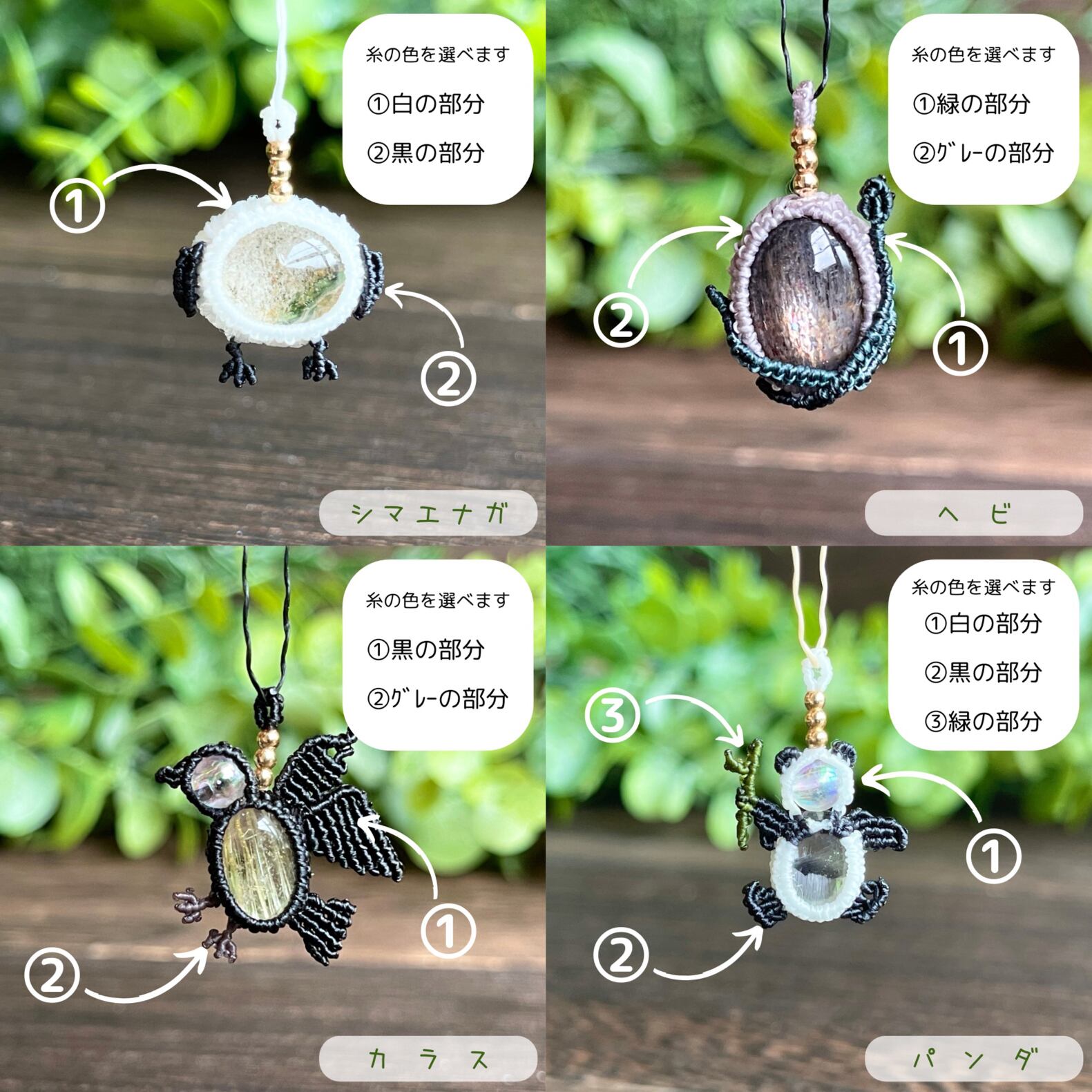 〜〜生きものモチーフセミオーダーの流れ〜〜 ⑴お好きな天然石を選ぶ(石の形によって作れる生きものが違います) ⑵商品オプションから「希望の生きものモチーフ」を選択 ⑶商品画像から希望の生きものモチーフを探し ⑷書かれている番号の通りに糸の色を決める ①〜③まである場合は3色決められます(同じ色も可) (糸の色サンプルは商品画像に載せています) ⑸希望のアクセサリー種類を選択する *~*~*~*~*~*~*~*~*~*~*~*~*~*~*~*~*~* ◆お値段は天然石代+オーダーメイド代(¥4,500)が含まれています ◆デザインによって追加料金が発生するものがあります ◆アクセサリー種類は以下から選べます チャーム/ネックレス(+¥700)/ピアス/イヤリング ◆糸の色みはなるべく近づけておりますがご覧になる液晶によって色の誤差が多少あります ◆ご注文を受けてから長めにみて1〜2週間以内に発送いたします その他ご要望や質問はショップの「質問する」や、公式LINEなどからお気軽にお聞きください! (この石でこの生きものはできますか?この部分の色は変えられますか?など) ————————————————————— 〈配送料と梱包について〉 ・宅急便コンパクト(¥500)はショップ名の入った箱で梱包 ・ゆうパケットポストmini(¥200)はOPPでの簡易包装 【詳細】https://usasisadah.theshop.jp/blog/2021/09/07/140155