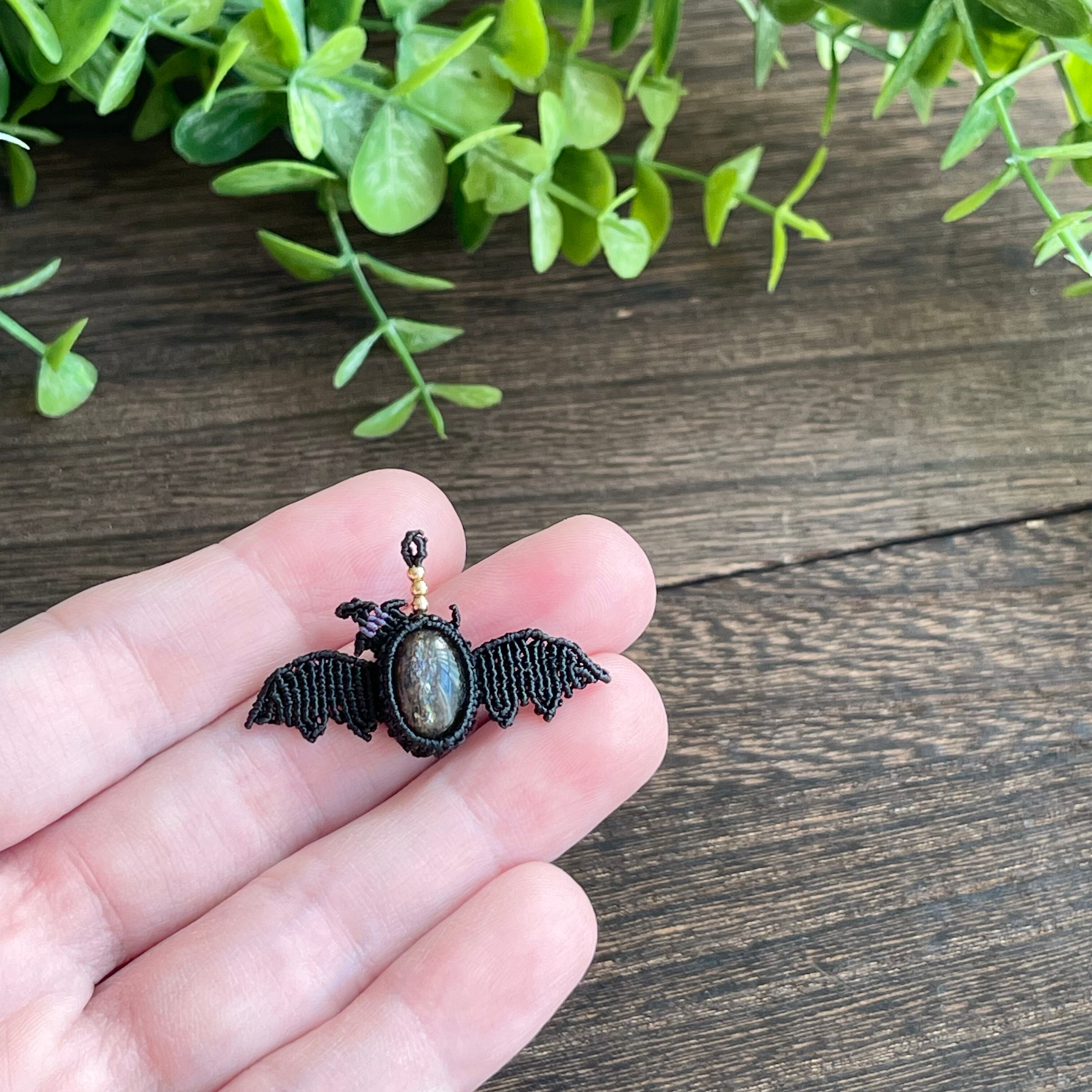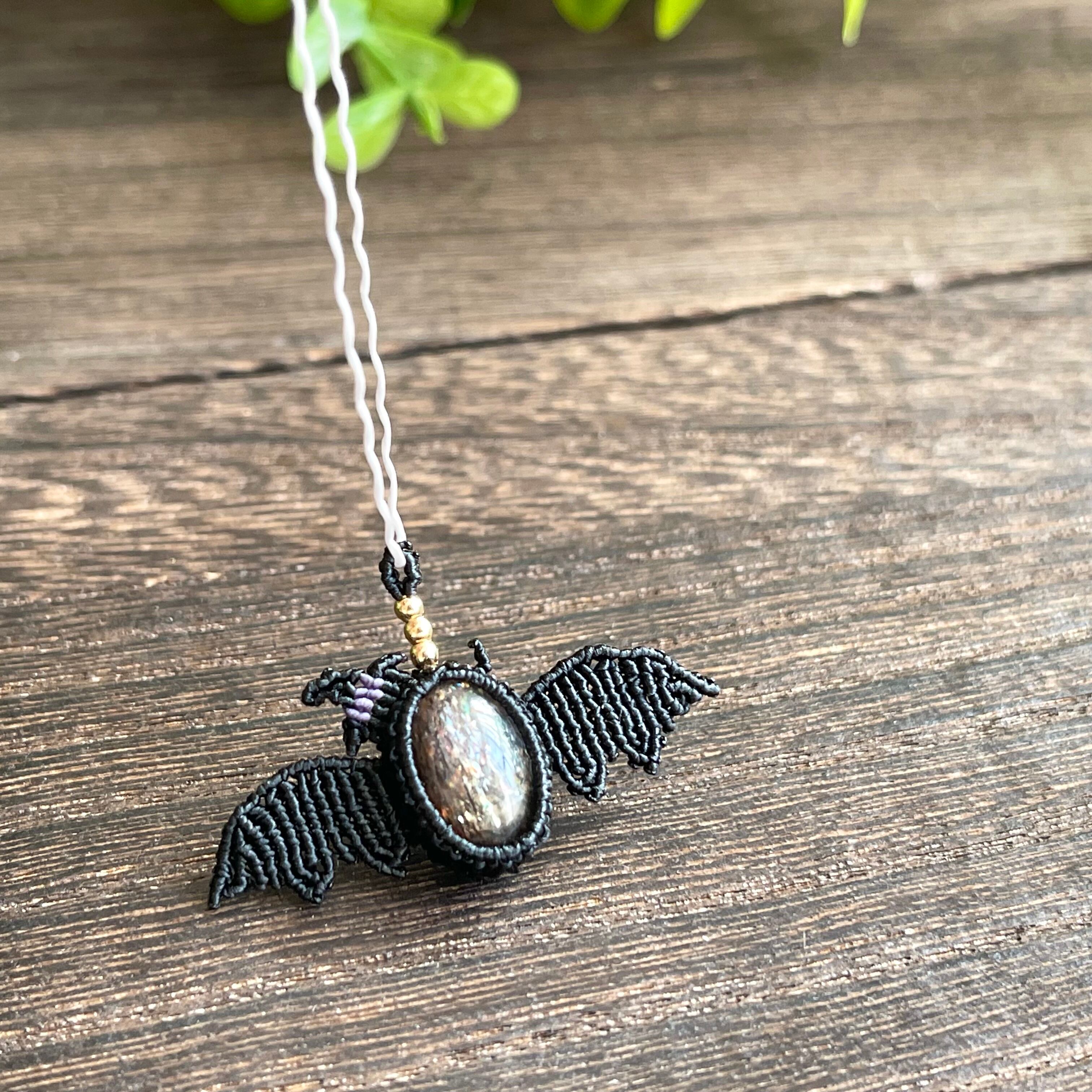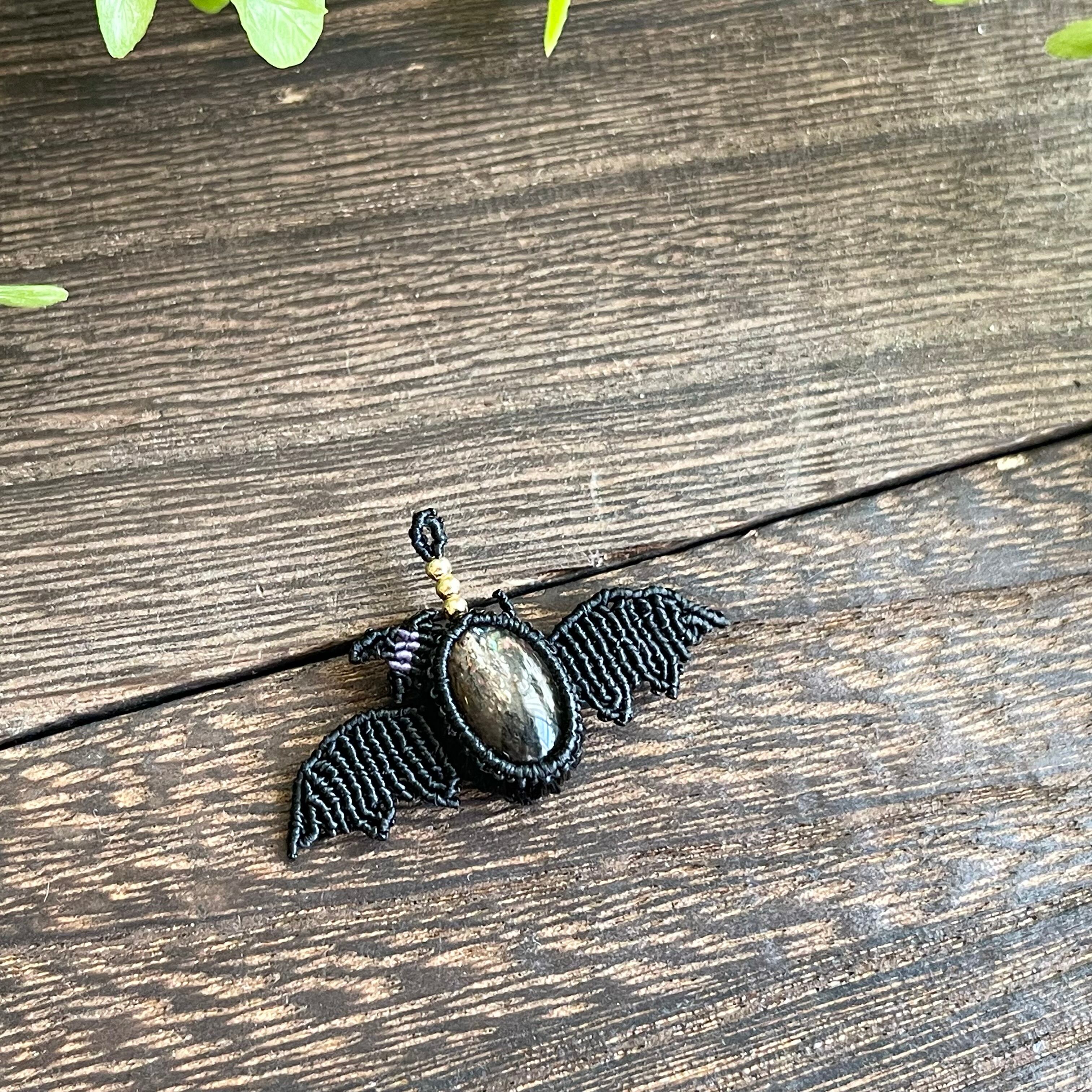 【限定】ブラックスターサンストーン[ハロウィンコウモリ]マクラメアクセサリー〈チャーム、ネックレス、ピアス、イヤリング〉