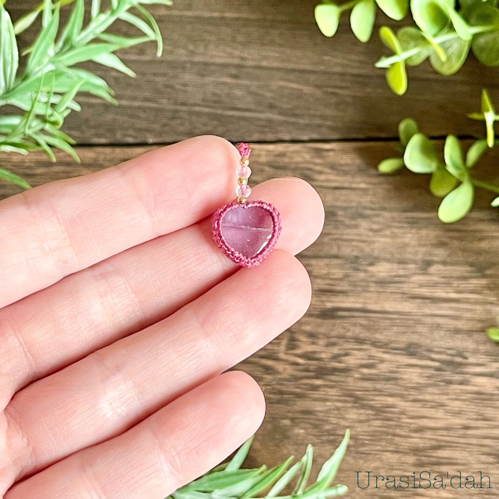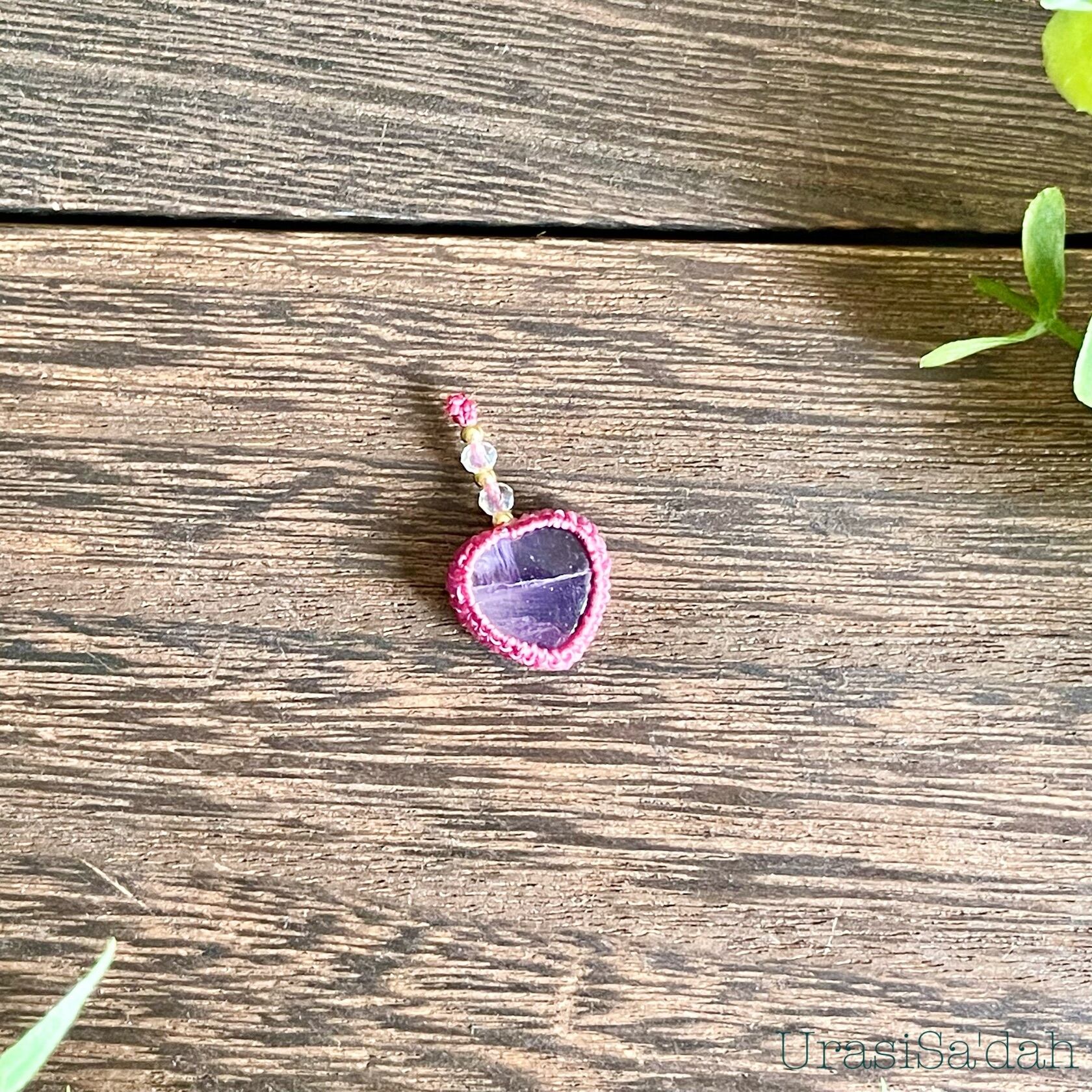 ラベンダーフローライト[ハート]マクラメアクセサリー〈チャーム、ネックレス、ピアス、イヤリング〉