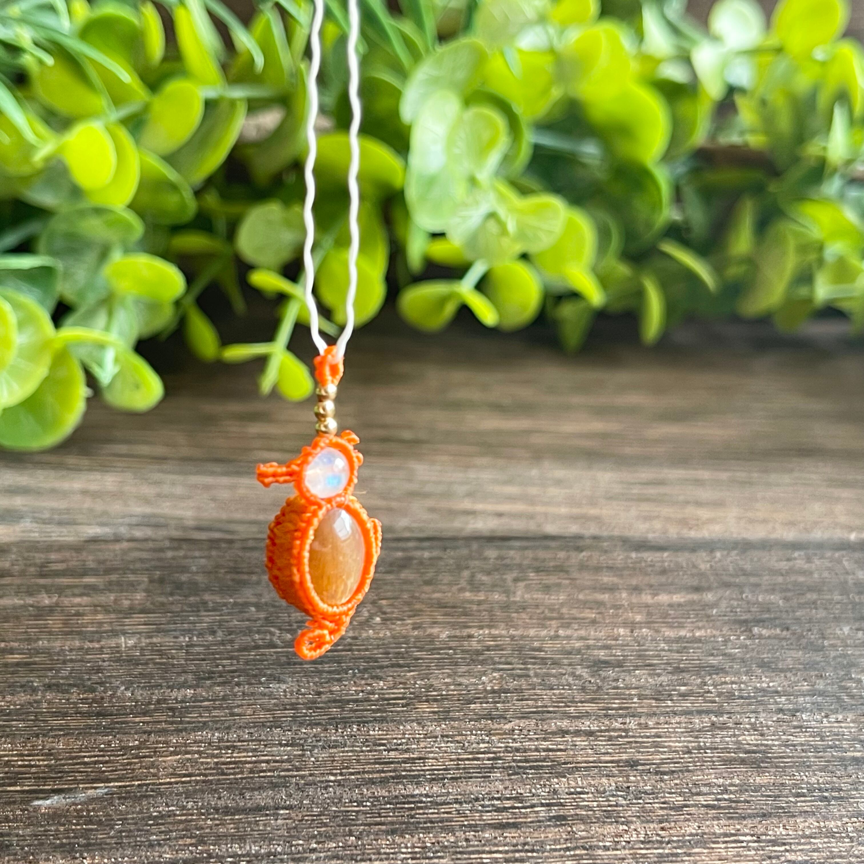 スターサンストーン[タツノオトシゴ]マクラメアクセサリー〈チャーム、ネックレス、ピアス、イヤリング〉