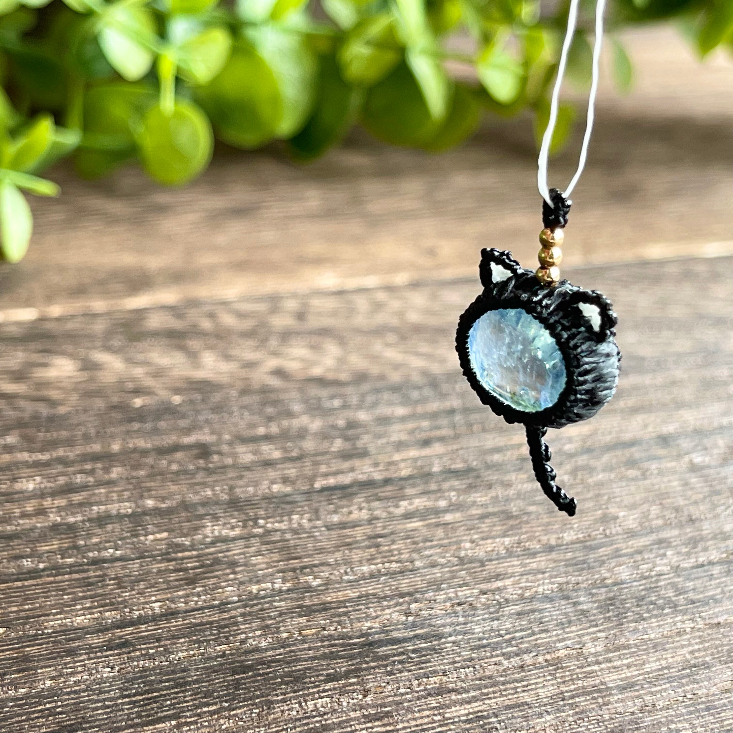 アクアマリン[黒ネコ]マクラメアクセサリー〈チャーム、ネックレス、ピアス、イヤリング〉