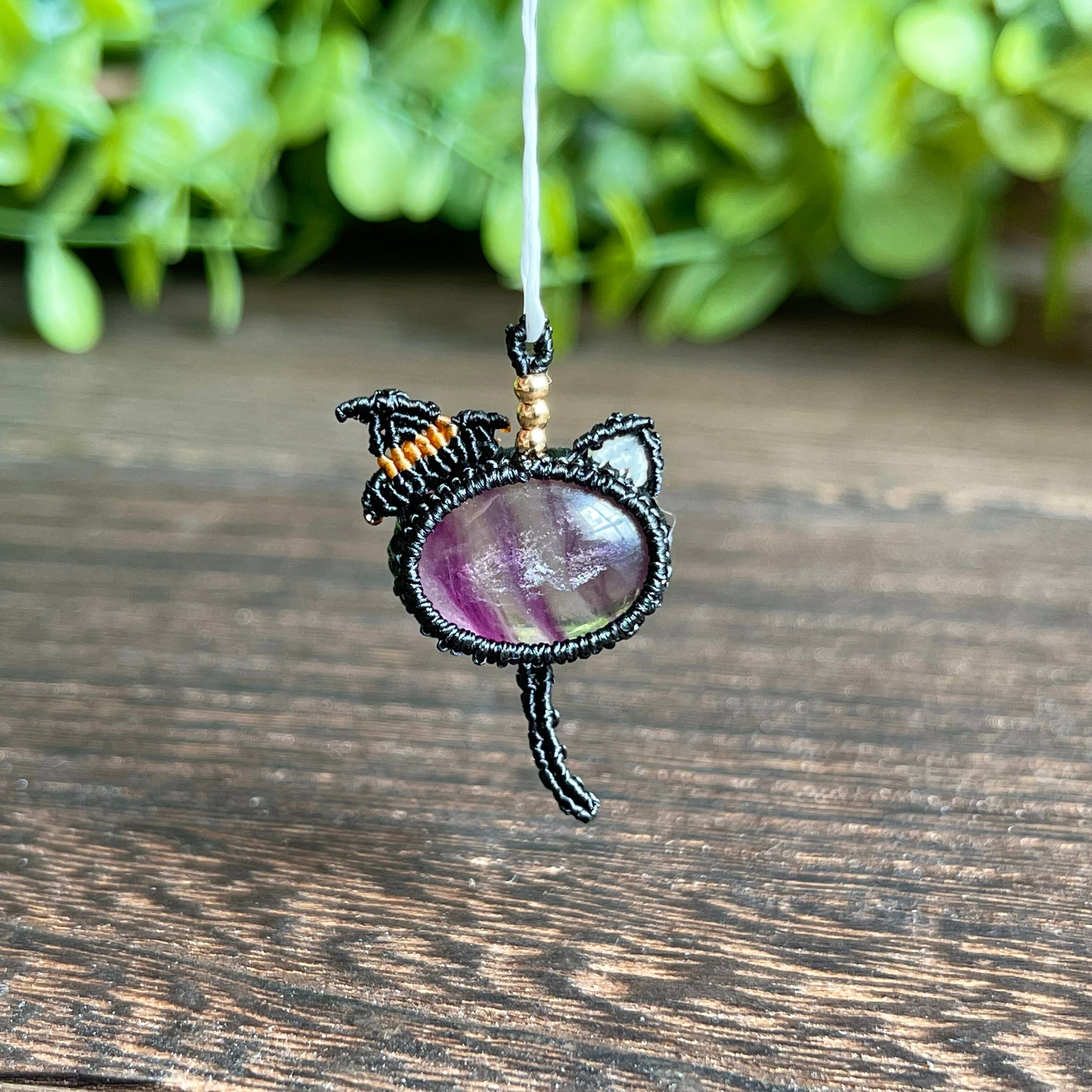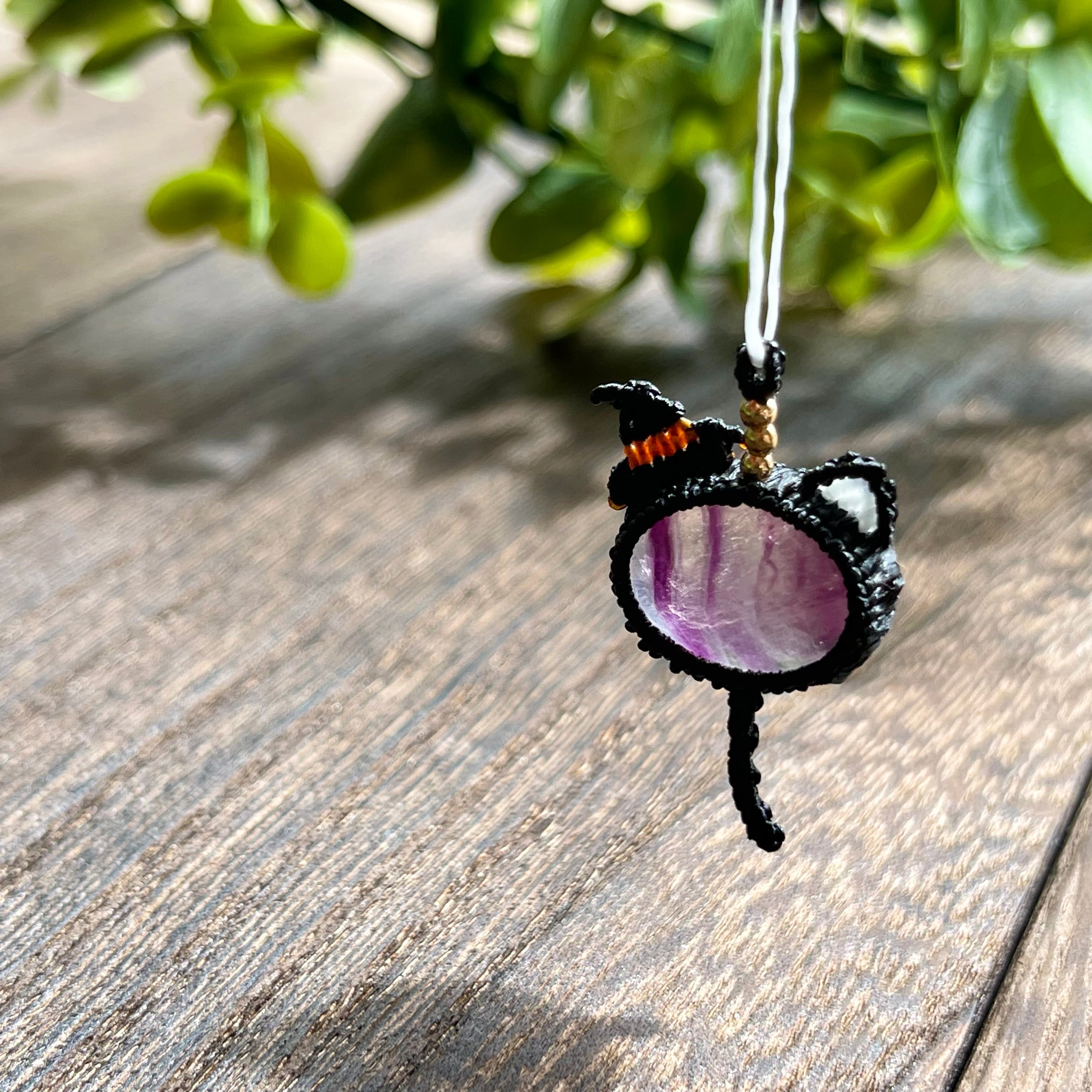フローライト[ハロウィン黒ネコ]マクラメアクセサリー〈チャーム、ネックレス、ピアス、イヤリング〉